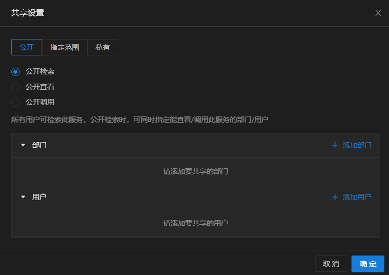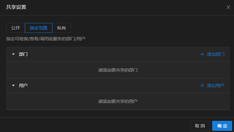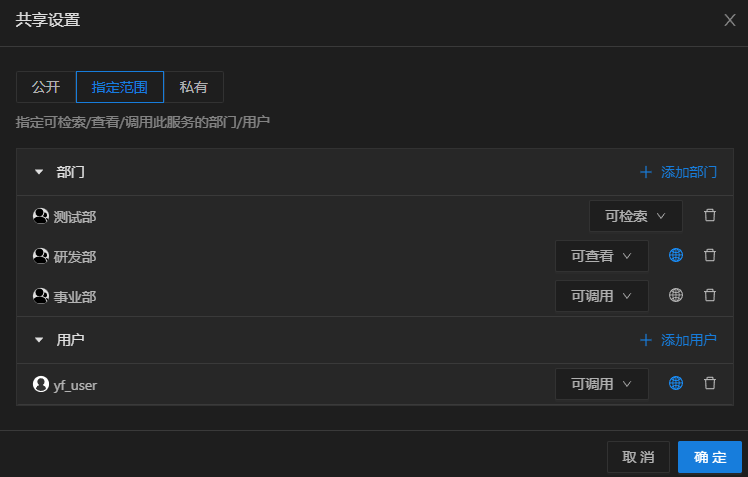 - 按空间范围共享:指定部门或用户可查看/可调用时,点击