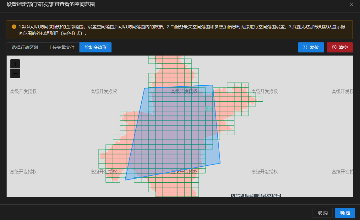 ,可以通过选择行政区、上传GeoJson矢量文件或者绘制多边形的方式设置共享的空间范围,指定部门或用户有权限的部分为设置的蓝色区域,当部门和此部门的用户分别设置空间范围时,此用户有权限的范围为二者的并集;
