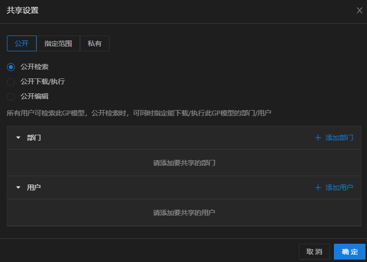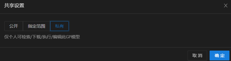- 私有:仅GP模型资源的创建者可检索/下载/执行/编辑/删除资源、查看/编辑资源详情、更改共享设置。