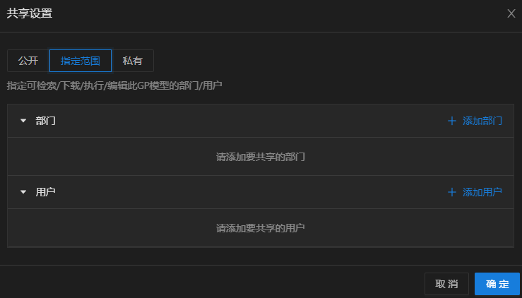指定范围:可指定部门/用户范围,只有该范围内的用户可检索/下载/编辑GP模型资源。