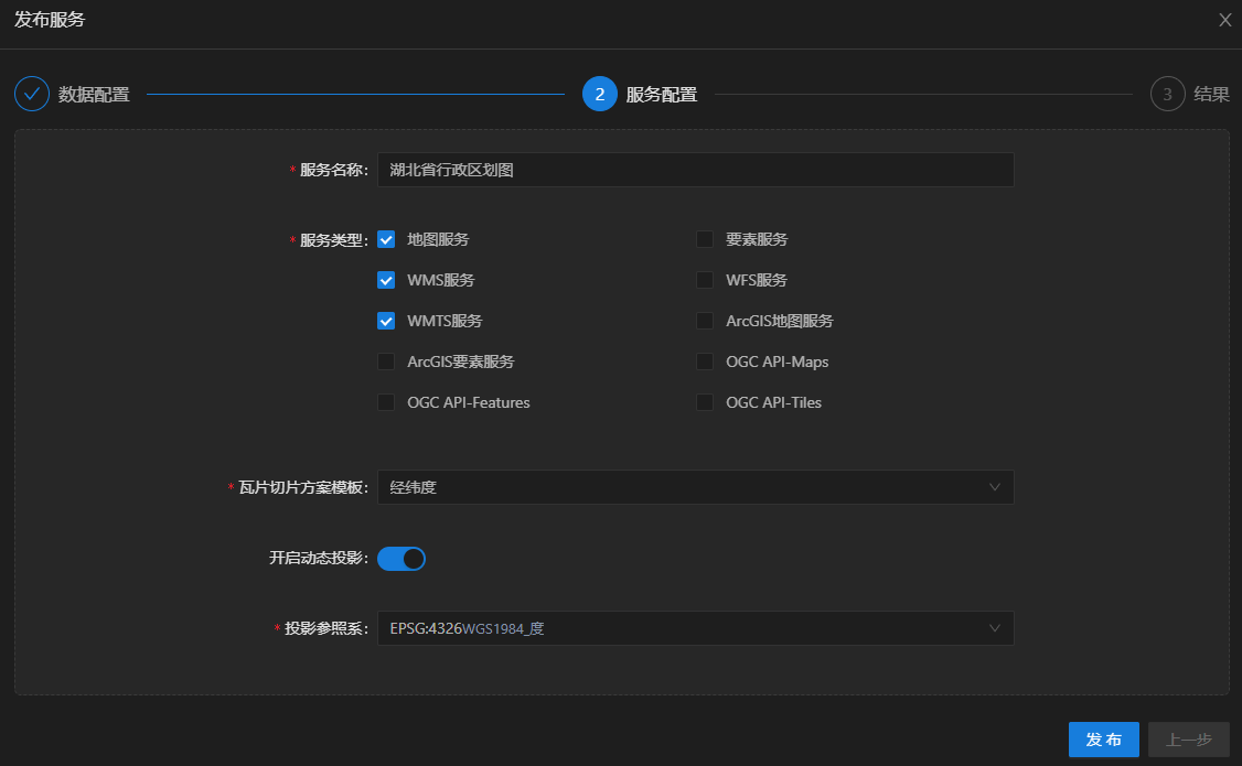 2. 选择服务类型,可选择是否开启动态投影,选择WMTS或OGC API-Tiles服务类型时需选择瓦片切片方案;