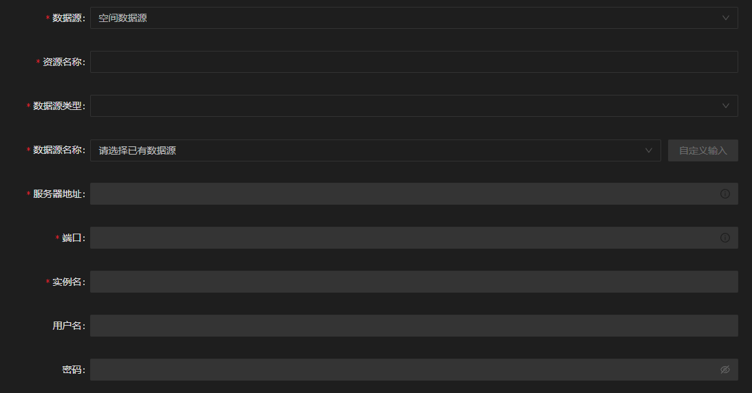 2. 可下拉选择已有的数据源或自定义输入数据源信息,下拉选择已有数据源时,后台需提前配置好数据源,参考"服务器配置"章节;