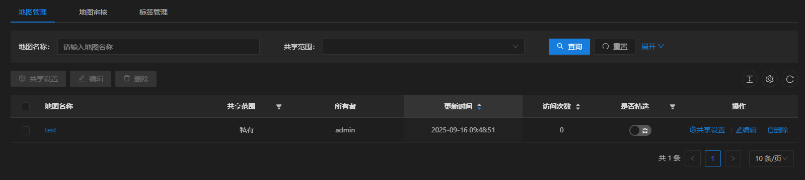 4. 列表中选择单个或多个地图资源,点击"共享设置",可修改地图资源的共享设置,具体可参考"地图共享设置";