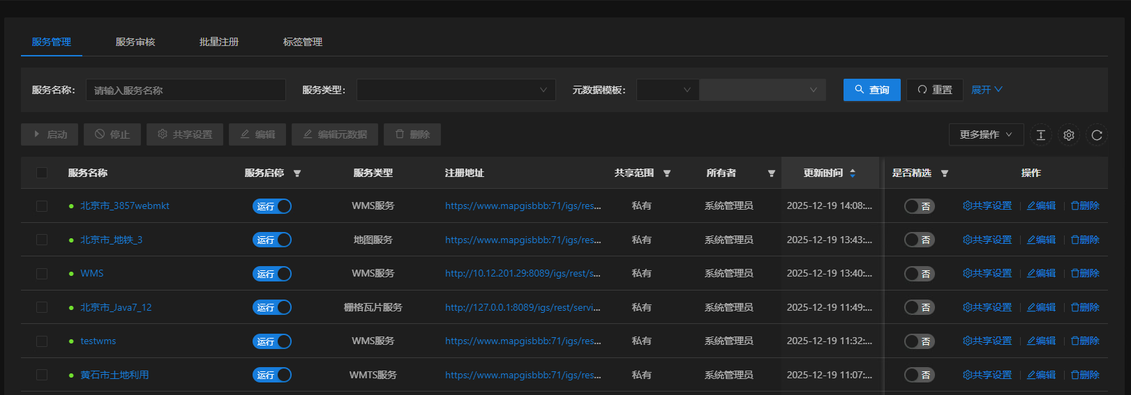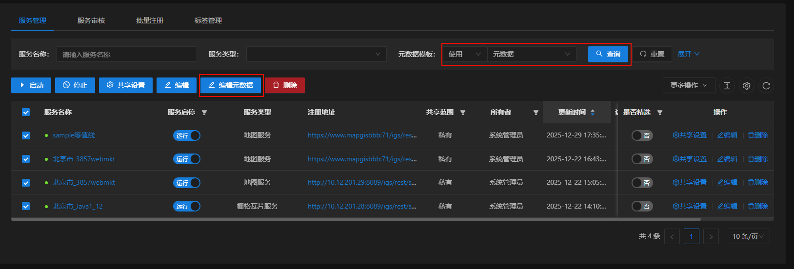 6. 筛选出使用指定元数据模板的服务,然后在列表中选择单个或多个服务资源,点击"编辑元数据",可以在页面上统编服务的元数据信息,也可以将元数据信息导出为表格,进行统一修改后再导入;