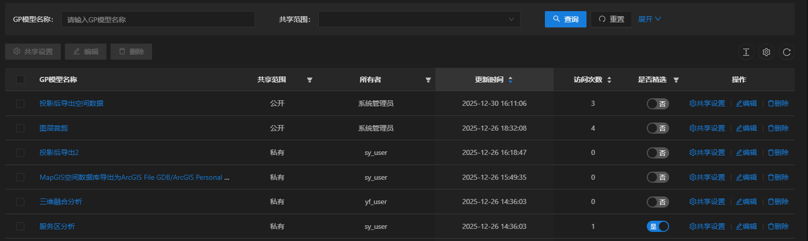 4. 列表中选择单个或多个GP模型资源,点击"共享设置",可修改GP模型资源的共享设置,具体可参考"GP模型共享设置";