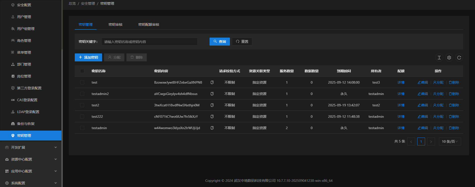 - 选择"后台管理"->"安全管理"->"密钥管理",密钥管理页面显示组织权限内所有密钥信息,包括名称、内容、到期时间、所有者及配额等。