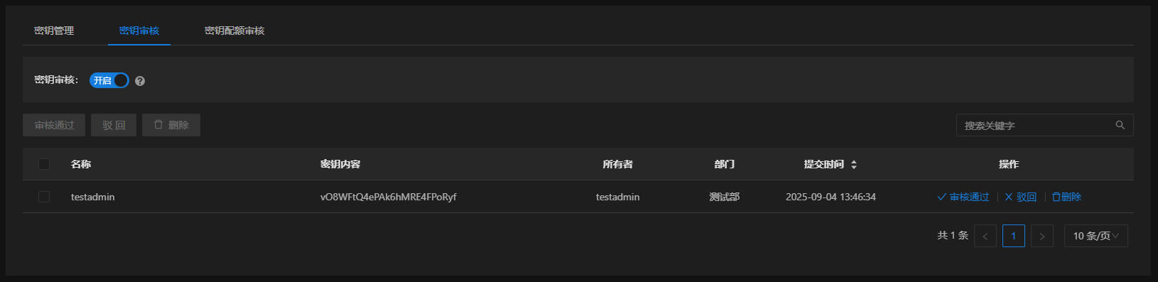 - 开启密钥审核后,普通用户创建的密钥需要管理员审核通过后才能生效;若不开启审核则普通用户创建的密钥可直接使用;