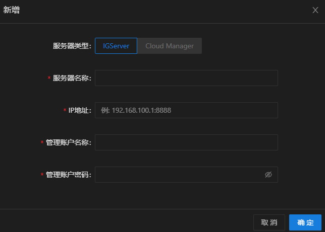 2. 点击“新增”按钮,弹出新增对话框;输入相关配置信息后,点击“确认”即可完成服务器新增;