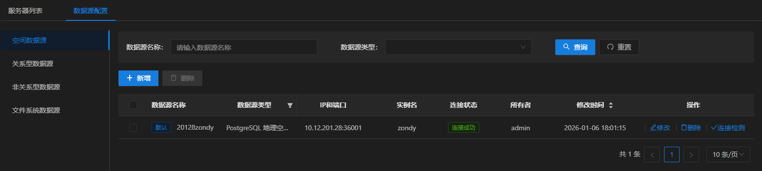 空间数据源是安装了GIS扩展插件的关系型数据源;注册数据资源时可读取空间数据源中的点线区图层;将GeoJson、Shapefile、CSV、Excel地理空间数据资源发布为服务时,会将数据导入默认的空间数据源中。