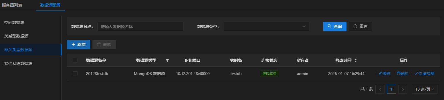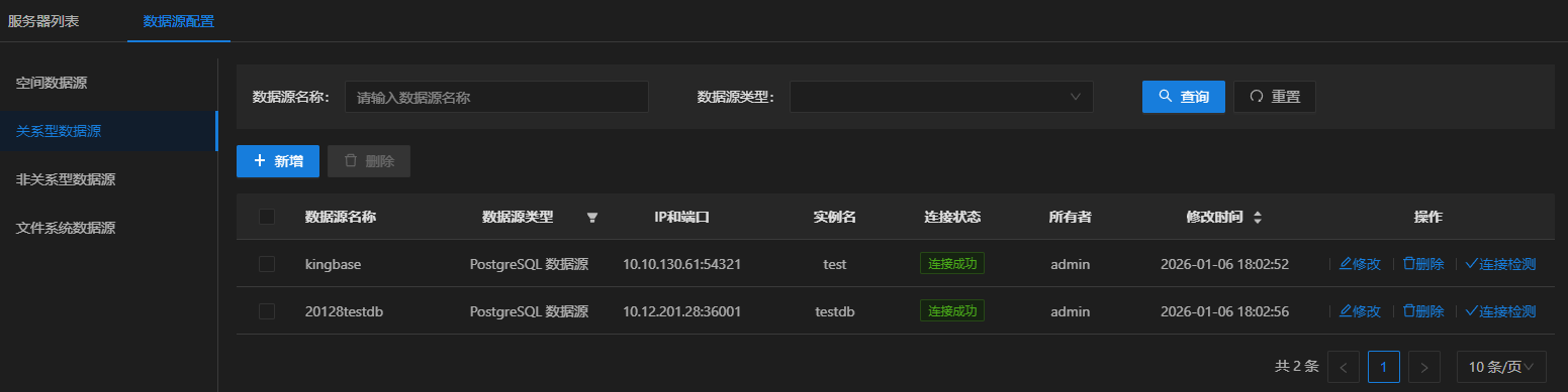 4. 列表中选中数据源可以进行修改和删除操作,对应的IGServer数据源管理也会得到修改和删除。如果已经将数据发布为服务,删除数据源后可能会影响服务有效性,请谨慎操作。