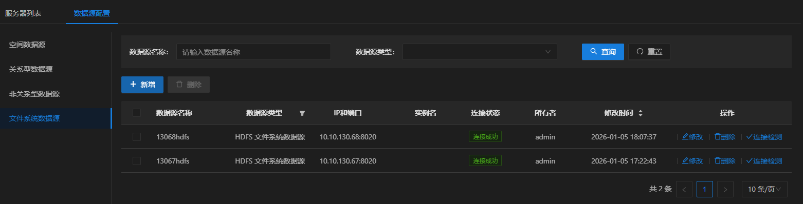 - 【类型】:选择 HDFS 文件系统数据源类型;