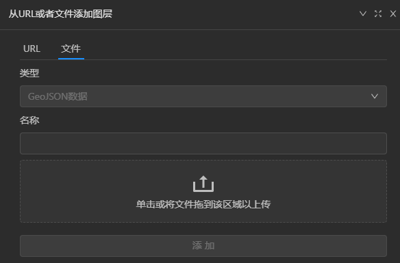 - 从文件中添加图层:选择本地GeoJSON文件上传,点击"添加"即可将GeoJSON文件添加进来供临时预览查看,仅支持EPSG4547、4490、4326的数据。