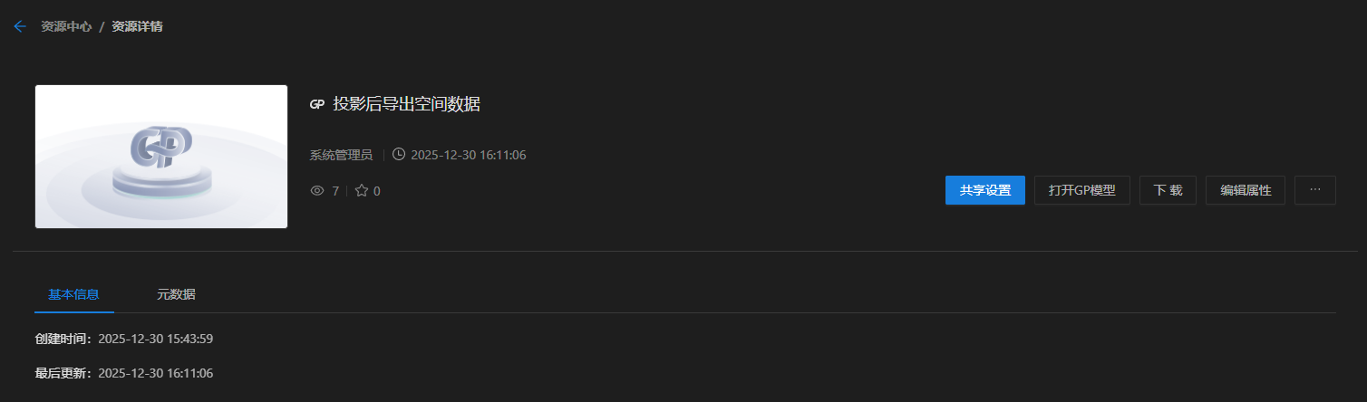 当用户具有某个GP模型资源的"检索"权限时,点击资源图片右下角的"查看详情",即可查看该资源的基本信息及元数据信息。