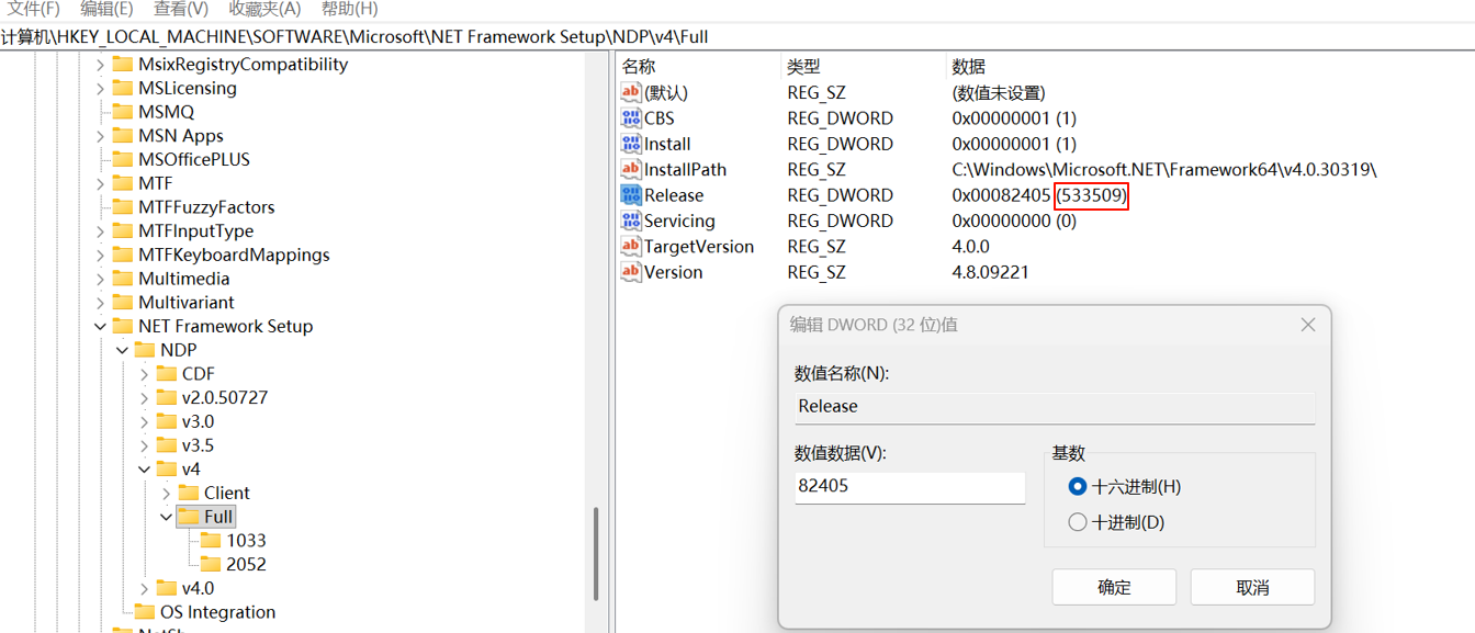 答:Windows操作系统为Windows 7 SP1或以上才支持.NET Framework 4.6.1或更高版本,若操作系统为Win7请安装SP1补丁包,若操作系统为Win11及以上,请查看注册表:按下 Win + R,输入 regedit 回车;展开\HKEY LOCAL MACHINE\SOFTWARE\Microsoft\NET Framework Setup\NDP\v4\Full,查看release值,括号中的数值大于等于394254时,可点击跳过安装,直接进行下一步。