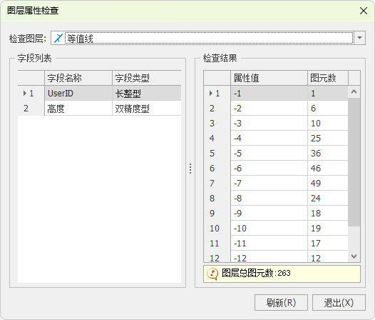 当某字段存在重复属性值时,"检查结果"列表中不重复罗列该值,但会在该属性值后的"图元数"中标注图元个数。