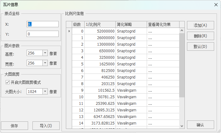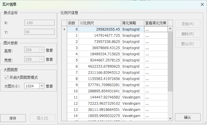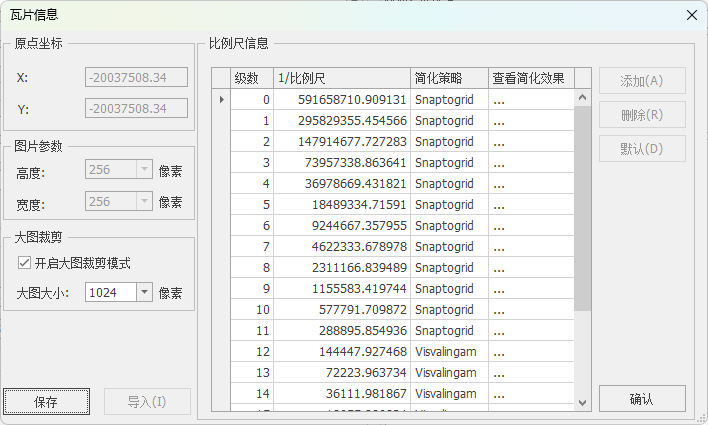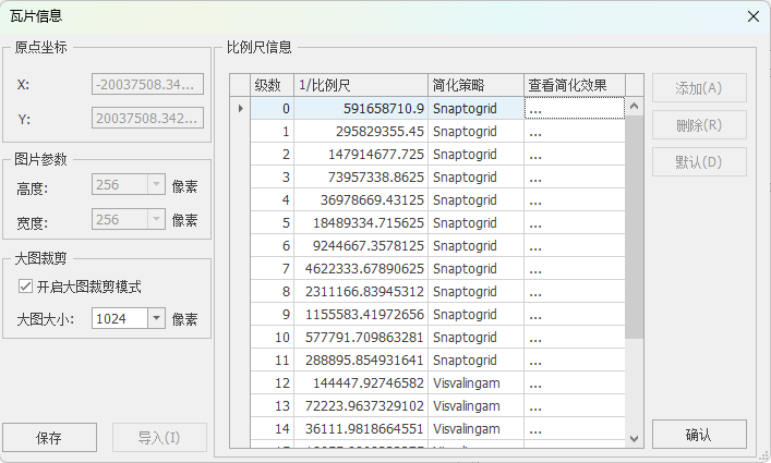 - 添加:可以添加瓦片级数,同时系统会以上一级比例尺的2倍的比例计算出新比例尺。同时,用户在比例尺栏中点击比例尺,也可以手动输入新的比例尺;