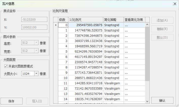 大图裁剪:瓦片裁剪后生成的最大图片的尺寸。大图尺寸越大,裁剪速率越高,但对裁剪服务器的配置要求也越高。