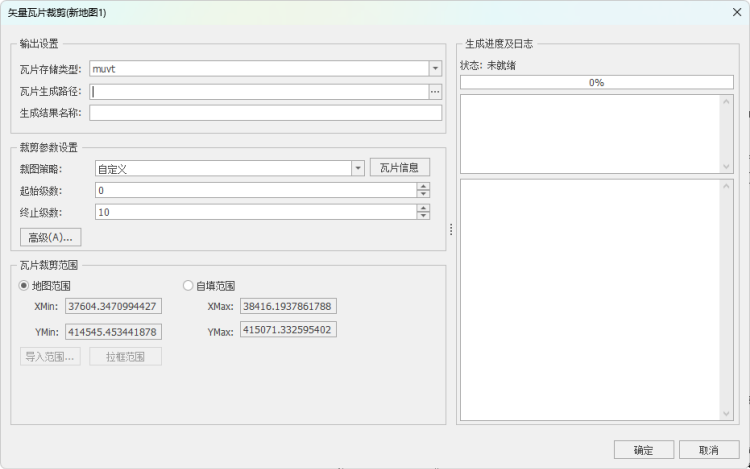 1. 打开已配图完成的矢量地图,启动"工具"菜单->"瓦片工具"面板->"矢量瓦片裁剪"功能,弹出如下图所示对话框。