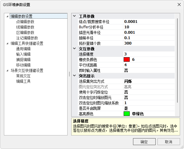 选择该节点下"点编辑参数"、"线编辑参数"、"区编辑参数"可分别设置输入点、线、区时的默认参数,(各参数意义可参见"通用编辑"下点线区修改参数章节)。