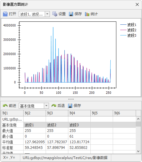 对话框中可显示该栅格数据各波段像元值的分布图及统计信息。