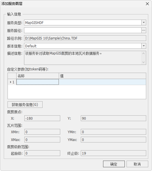 2. 选择服务类型为"MapGISHDF"。点击"服务路径"后方的按钮,可添加本地栅格瓦片数据;