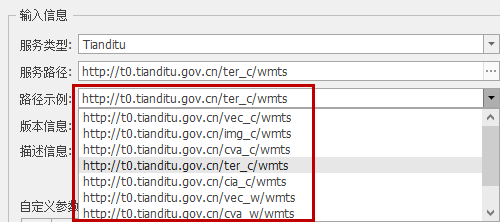 2. 选择服务类型为"天地图",在"路径示例"中下拉选择具体的服务地址: