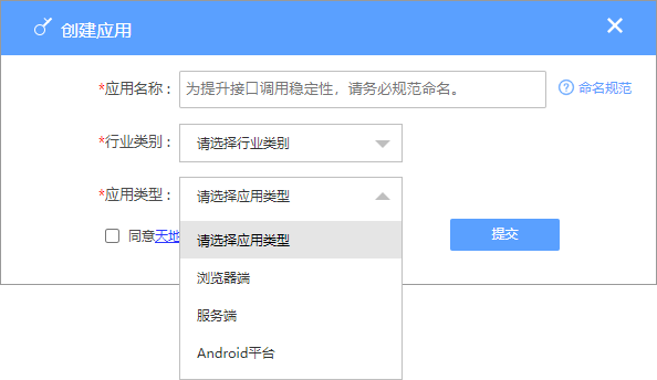 2、天地图在创建新应用获取tk时,包括多种应用类型。MapGIS需依赖"浏览器端"应用的tk。