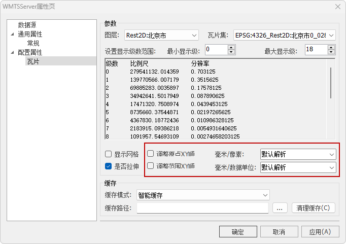 此处可显示瓦片裁剪时配置的裁剪级别信息。但栅格瓦片裁剪时可能只裁剪其中部分级别,未裁剪的级别此处会显示为灰色不可用。