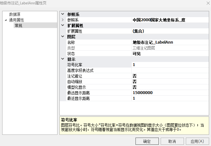 3. 在属性页的"常规"项中,您可以设置注记图层的参照系、显示状态等信息。"常规"项中具体的参数说明如下: