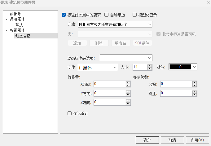 6. 在矢量图层属性页的配置属性项中,可配置图层的动态注记信息,动态注记设置页面如下图,其中参数说明如下: