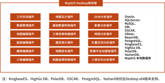 - 支持MapGIS本地数据库和多种国产、商用、开源数据库,包括:SQL Server、Oracle、MySQL、DM、OSCAR、GBase、BeyonDB、PostgreSQL、KingbaseES、HighGo DB、PolarDB、YashanDB等。
