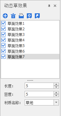 2. 点击菜单栏的添加按钮,通过鼠标在场景中交互添加草地,通过参数修改设置显示草地的长度和宽度,选择材质名称可以调整显示的草地类型。