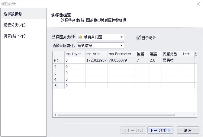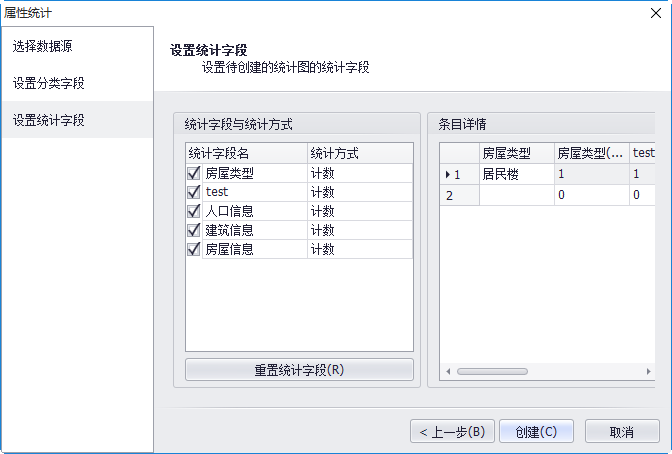 4. 完成“设置分段字段”项设置后,点击"下一步"(点击“上一步”回到“设置数据源”界面;点击"取消"退出“属性统计”界面)进入“设置统计字段”项,完成如下相应参数设置: