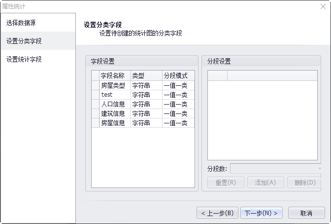 3. 完成“设置数据源”项设置后,点击"下一步"(点击"取消"退出“属性统计”界面)进入“设置分段字段”项,完成如下相应参数设置: