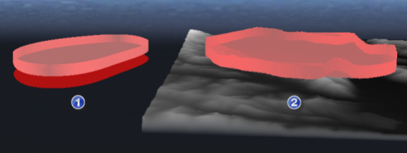【地形图层】:可基于地形生成封闭面,封闭面可与地形保持一致的起伏状态。此功能需保证当前场景下有可见地形模型。当源数据中有区图元在该地形上时,生成的面数据便如下图②所示随地形起伏(即在设置的“高程表达式”基础上增加地形的高程),而下图①中所示的区由于不在地形区域内,因此生成的面不受地形数据影响;