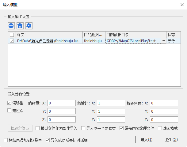 点击【三维建模】菜单下的【导入点云数据】,弹出导入模型数据对话框,添加las格式的数据,设置目的存储路径,目前支持数据导入到MapGISLocalPlus数据库中。其他的参数设置同普通模型导入,详细设置可参照3.8章节。