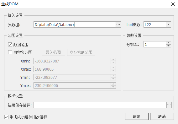 5. 设置输出DOM数据的分辨率以及输出路径,点击"确定",开始生成DOM。