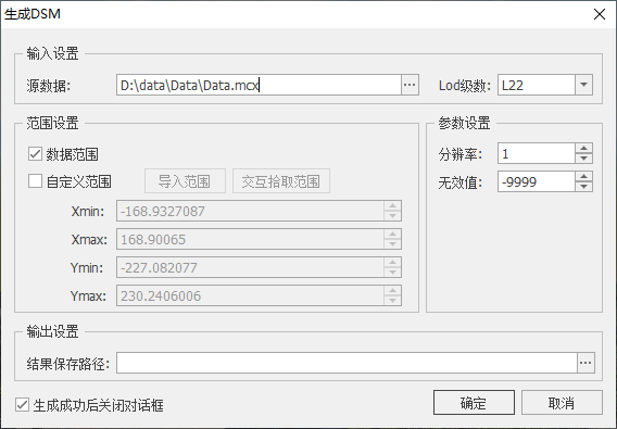 生成DSM的相关参数说明可参考前文"生成DOM"章节。设置完成后,点击"确定",开始生成DSM。
