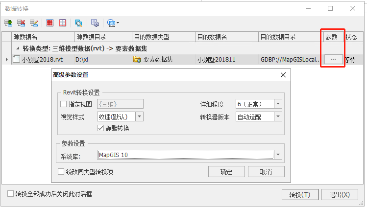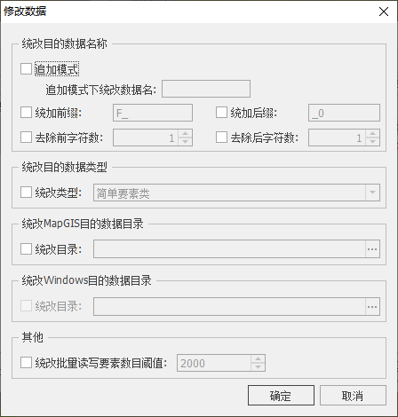 另外,在同时转换多条模型数据到GDB数据库时,可通过“修改”按钮,进行统改参数。可以统改目的数据名称、目的数据类型、目的数据目录等。