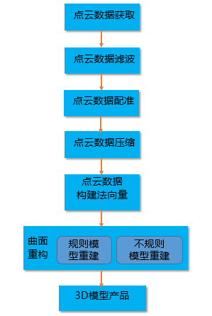 点云建模即将离散的点构建成实体模型。在MapGIS中,点云建模的基本过程包括:点云数据获取、点云数据滤波、点云数据配准、点云数据压缩、点云数据构建法向量、点云数据曲面重构(构建三角网) 最终模型产品(3D模型 其他应用 )。