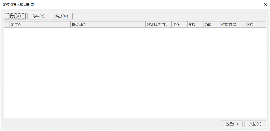 1. 在三维场景视图中点击【三维建模】-【定位点配置】,弹出定位点导入模型配置对话框,如下图所示: