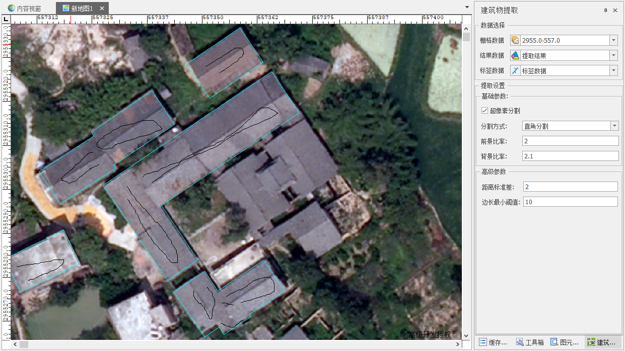 “建筑物提取”是通过半自动的交互工具,将影像数据中的建筑物提取出矢量,提取结果为区简单要素类。建议影像数据分辨率0.1米及以上。