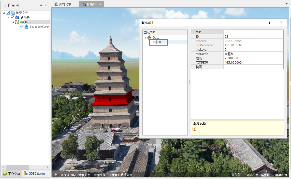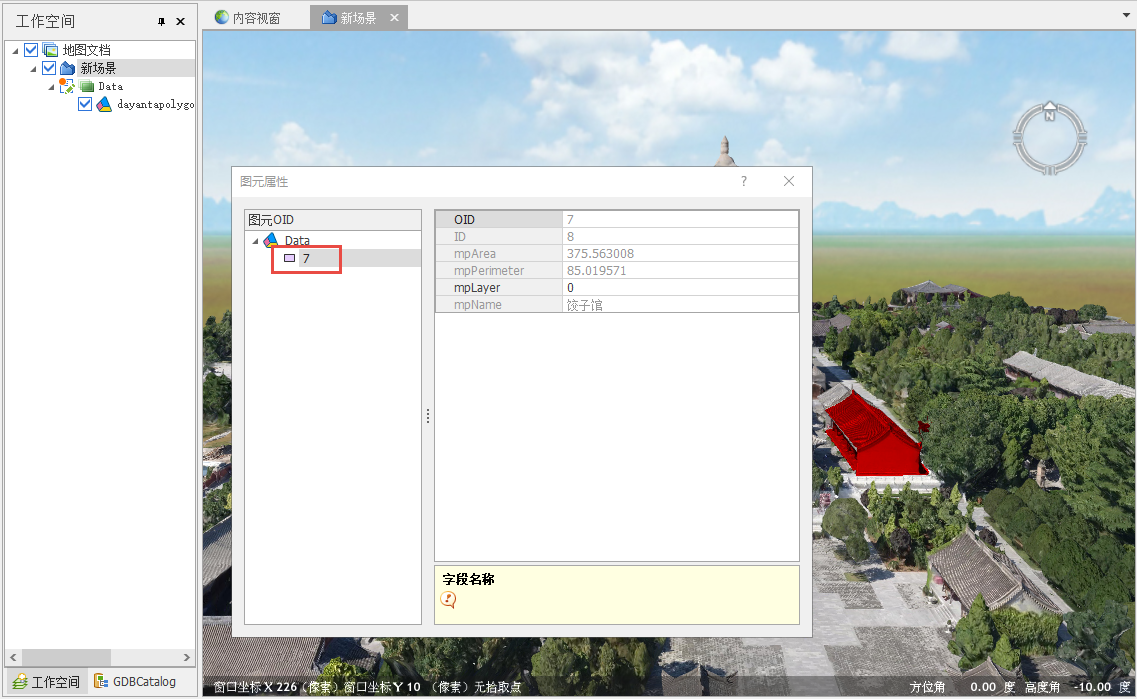 3. 点击【数据】面板-【倾斜摄影数据】-【图查属性】,在视图中单击模型可进行数据的预览和信息拾取,如下图所示:
