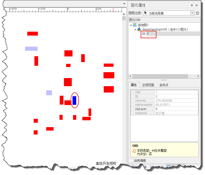 在工作空间中添加新地图,然后添加该矢量区图层进行预览,选择其中的区要素查看属性(下图为7号区要素),其显示结果如下图所示: