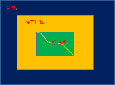 - 【前景比率y/背景比率x】:首先用户随意画出一条标记(黄线),其最小外包矩形(绿色矩形)的x倍表示预估的可能感兴趣的前景区域范围(蓝色矩形),最小外包矩形(绿色矩形)的y倍表示整个待提取的研究区域范围(黄色矩形),蓝色与黄色矩形的差表示确定的背景区域,作为背景样本。