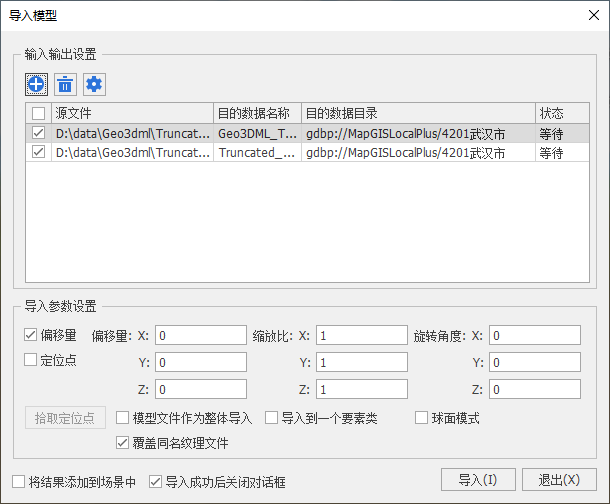 【追加模式】:如果希望将当前导入的模型合并到数据库中的模型数据中,以一个数据共同显示,需在设置中勾选此项,并在【目的要素类】中选择待合并的模型数据;