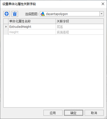 单体化属性字段包含“ExtrudedHeight”字段和“Height”字段,其中“ExtrudedHeight”字段与矢量数据的“层高”字段相关联,而“Height”字段则与矢量数据的“底面高程”字段相关联。层高,即单个楼层的高度;底面高程,即单个楼层的底面高程值。