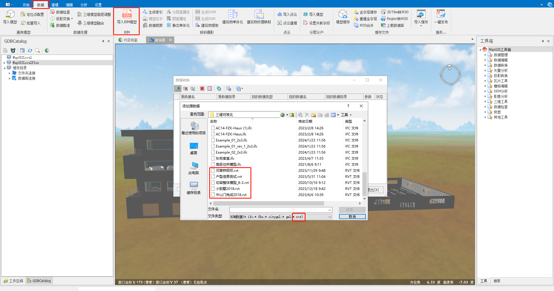 1. 在三维场景视图中点击【三维建模】-【BIM数据】-【导入BIM模型】菜单,弹出对话框;