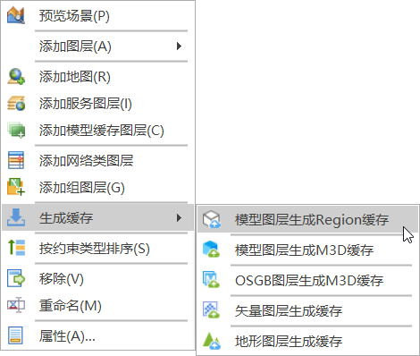 1. 在场景视图中添加模型数据,在场景节点,右键【生成缓存】->【模型图层生成Region缓存】: