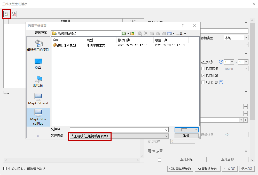 对于通用景观等人工精模,导入到MapGIS GDB中后,可生成三维面/体简单要素类。通过此工具,可将人工精模数据转换为M3D缓存数据。